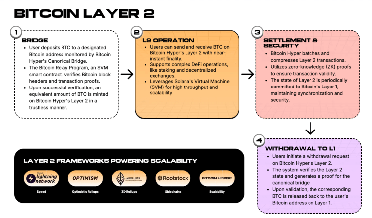 Secondo le specifiche, Bitcoin Hyper permette di depositare BTC in un indirizzo osservato, dopodiché un contratto su Solana Virtual Machine (SVM) verifica i relativi header o proof. Questo processo porta alla creazione dell’equivalente tokenizzato su Hyper, che può essere usato nella rete L2 per transazioni rapide, staking, scambi e applicazioni decentrate. Periodicamente, le transazioni vengono “ancorate” indietro su Bitcoin usando prove ZK (zero-knowledge), per garantire che il token L2 resti collegato al valore reale di BTC su L1.
