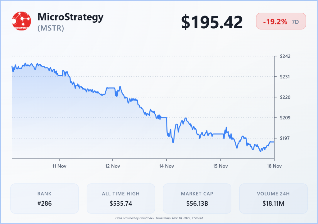 The recent market pullback has weighed on Strategy’s stock. MSTR on Nasdaq has dropped more than 16% in the past five days, falling to $197.03.