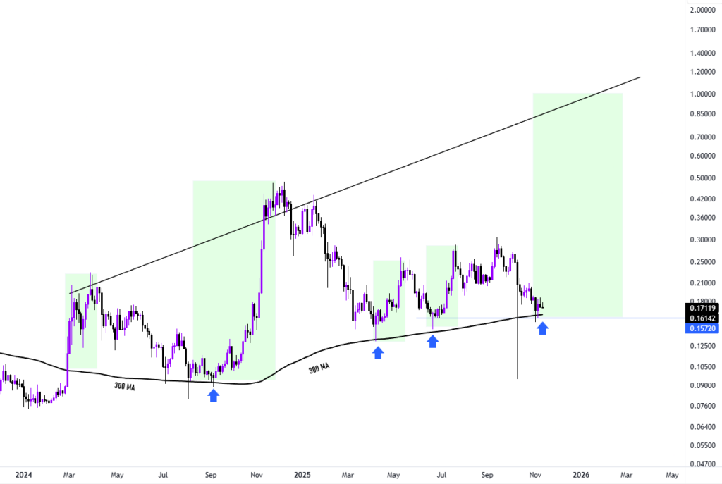 If buyers manage to flip that zone, market technicians say the chart opens room back toward the $0.22–$0.26 pocket. This move would revive the long-running $1 target that always returns once sentiment turns.