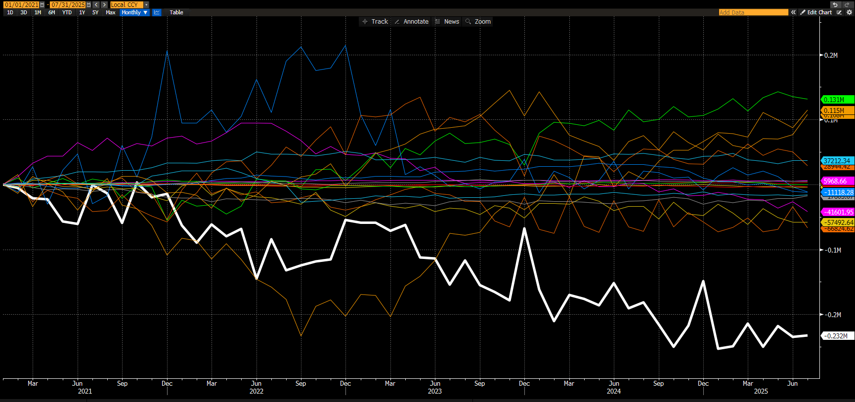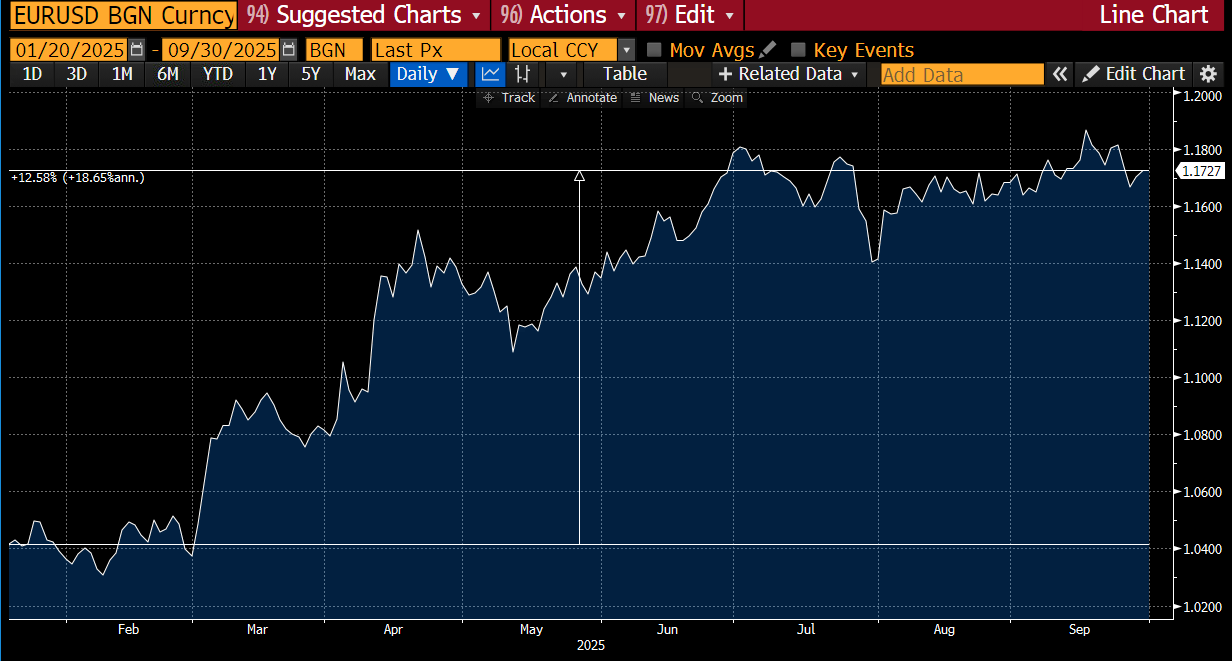 To grow US exports at the expense of mostly German and other EU countries’ exports, Bessent must weaken the dollar versus the euro dramatically. Continuing to run massive deficits, proclaiming an industrial policy and the associated explosion of bank credit generation, teasing a gold revelation, browbeating the Fed to cut rates when by all objective measures the US economy is strong to very strong, etc. are all policies which will ceteris paribus weaken the dollar vs. most other fiat currencies including the euro. While Bessent is busy trashing the dollar to supercharge Pax Americana’s manufacturing resurgence, Lagarde is busy running too tight of a monetary policy in order to discipline democratically elected politicians of member countries who want to spend money on populist policies. This is why the euro appreciated 12% vs. the dollar since Trump ascended the throne.