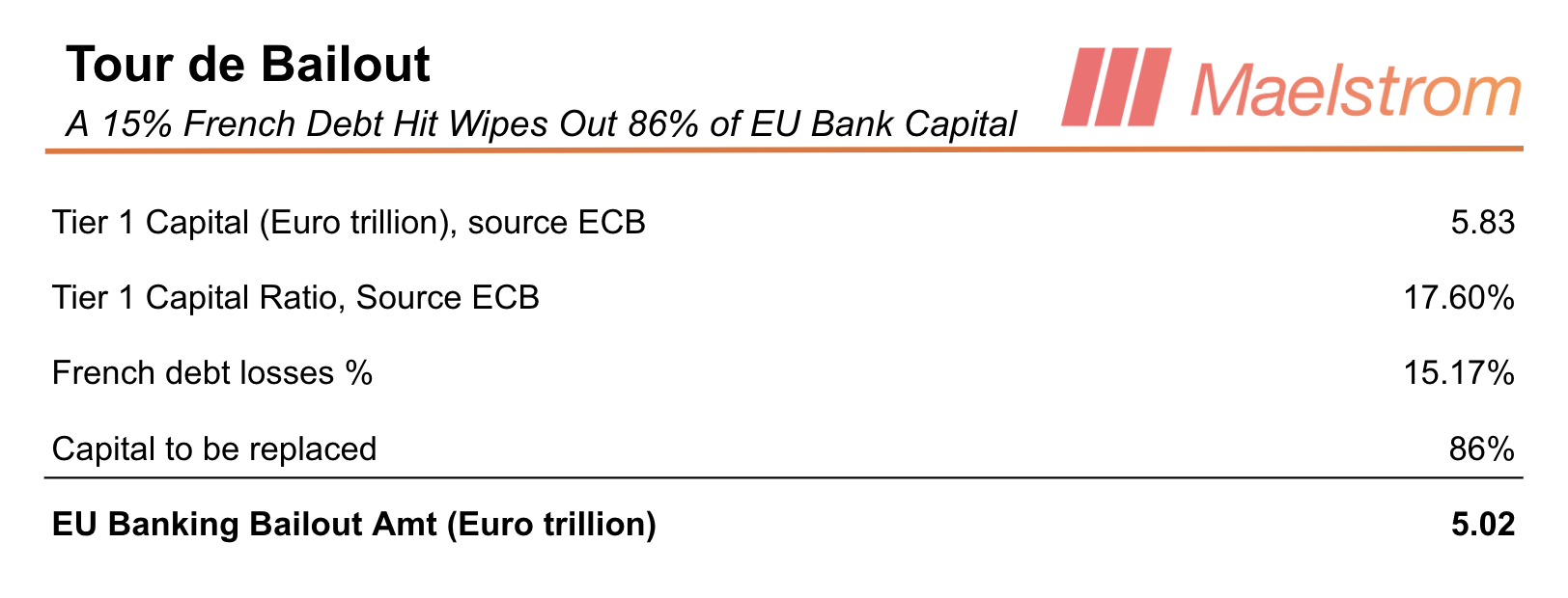 Most global banking regulators do not appreciate how digital banking speeds up the transmission of a bank run. Therefore, a significant amount of the capital could leave quickly before the French banking regulators and or the ECB react and restrict movement of capital out of the French or European banking system. Putting a finger in the air, I estimate that 25% of this capital could leave within a few days before the imposition of capital controls. This amounts to EUR 650 bn.