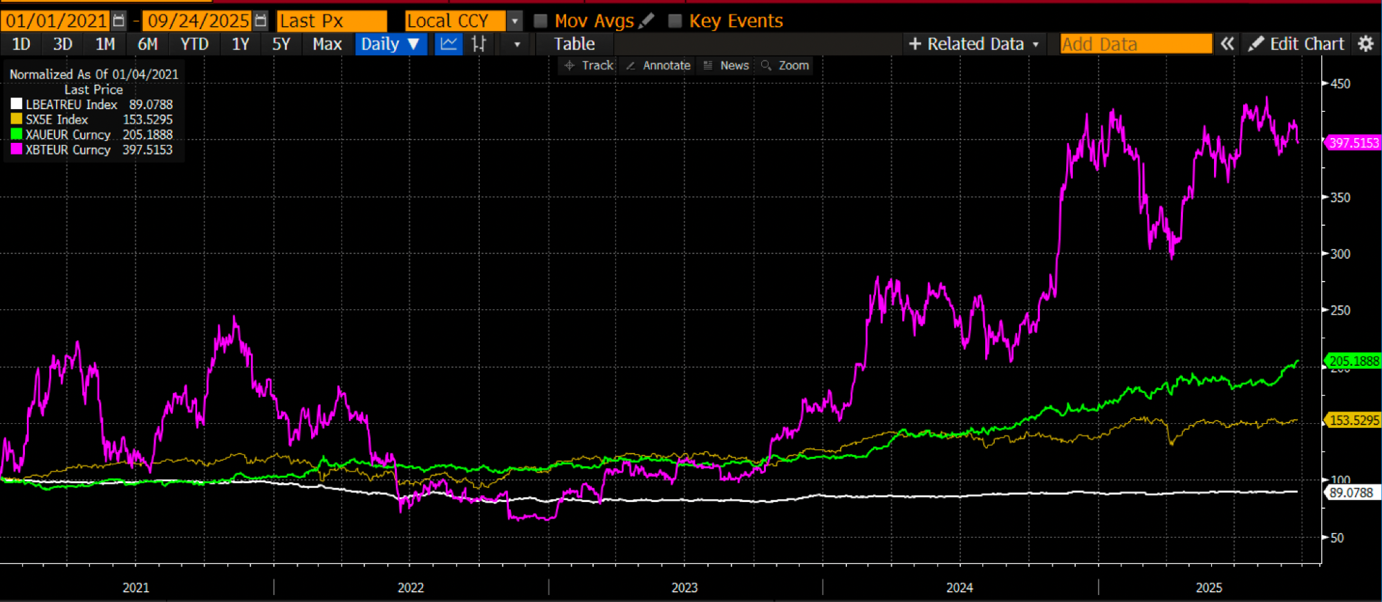 Over the same time frame, The Bloomberg EuroAgg Bond Index (white) and the EuroStoxx 50 Index (yellow) underperformed Bitcoin (magenta) and gold (green) in euro terms.