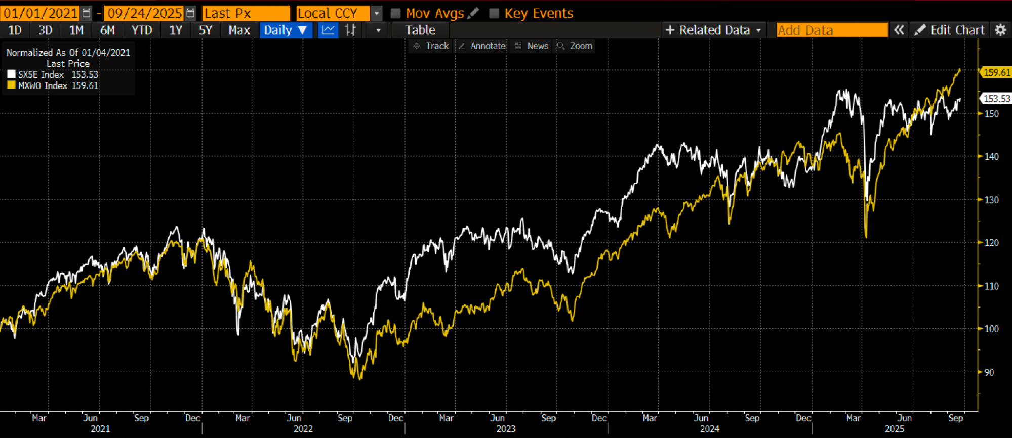 The EuroStoxx 50 Index (white) underperformed the MSCI World Index (yellow) from 2021 to the present.